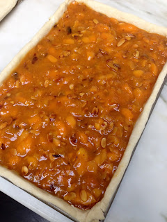 Spread the apricot filling evenly over the bottom half of the dough, leaving a 1/2-inch border. Fold the top half of the dough over the filling, pressing along the edges to secure the sides. Press lightly along the edges with the back of a fork to seal. Brush egg wash all over the top of the dough. Using a paring knife, cut 5 small steam vents in the dough at about 3-inch intervals.