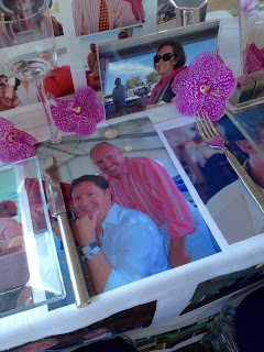 on the tablecloth peered out of plexiglass frames that ran down the center of the table along with pink orchids cut for the occasion.   The food was all catered by our go-to take out purveyor, Loaves and Fishes.  Lobster and steak salads joined the greenest peas on earth and our local Rosé flowed freely.   Then came Andrew’s annual parade of phenomenal confections.   Placed at the end of the table, they are so well-known and well-liked that a steady stream of friends stopped by to sample Andrew’s handiwork.