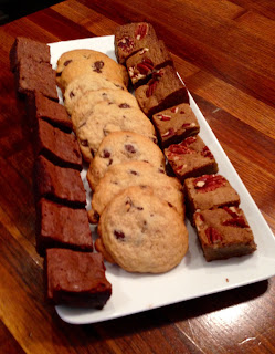 Every year, Andrew outdoes himself with his sweets.  This year, in honor of the Anniversary, he went back into the vaults and presented two of his (and your) all-time favorites:  Butterscotch Brownies and Chocolate Chip Cookies.  These two recipes have appeared here before.  Follow these links and you’ll come to these recipes.  For the Butterscotch Brownies: http://chewingthefat.us.com/2012/07/the-treats-trucks-recipe-for.html  and for the Chocolate Chip Cookies, click here: http://chewingthefat.us.com/2012/09/we-took-joanne-chang-john-barricelli.html     The new entry this year was for a Brownie, so dense and chocolate-y it takes the prize for best Brownie ever.   The recipe came from Dorie Greenspan’s “Baking: From My Home to Yours” (Houghton Mifflin 2006).  But talk about provenance!  A Boston-based pastry chef named Rick Katz was laboring away helping Julia Child to produce the recipes for the “Baking with Julia” TV series and its accompanying book.   There were 26 chefs involved but somehow Rick Katz managed to produce extra sweets, these brownies among them.  They are very dark, very fudgy and made in away that Dorie Greenspan had never seen a brownie made before.   Half the eggs and sugar are mixed in with the chocolate while the other half are beaten until they double in volume.  That gives you a brownie that is light as a sponge.  “Whipping the eggs”, Dorie writes, “creates the surprisingly creamy, soft and definitively fudgy texture.  Here is the recipe”
