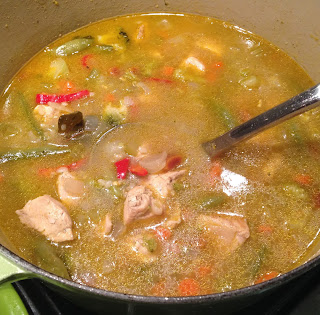4. Add the chicken and the chicken stock all at once and bring the soup to a boil. Reduce heat and simmer 10 to 12 minutes.
