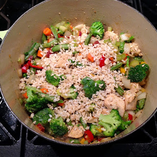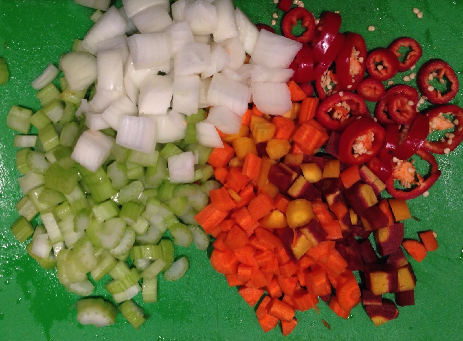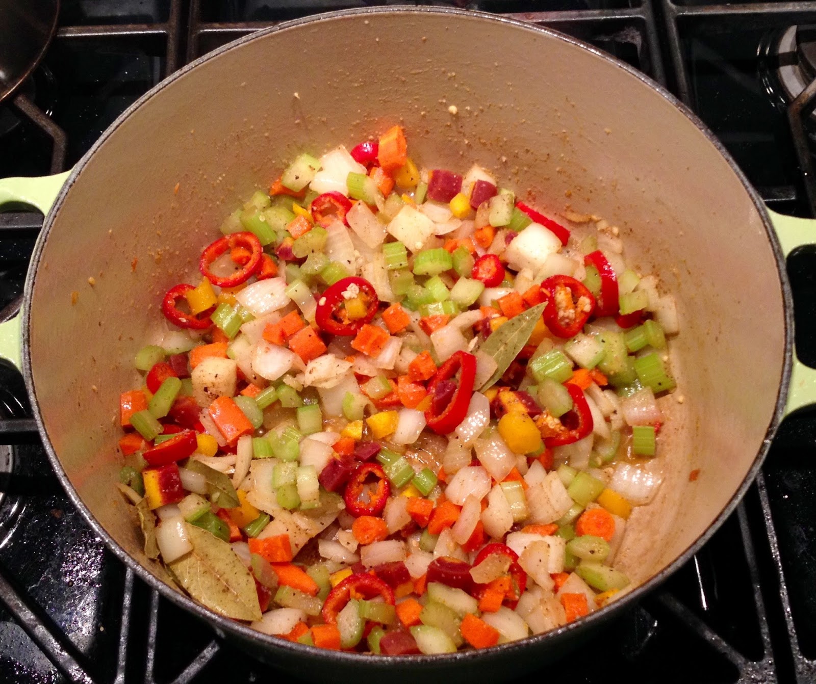 2. Add the rest of the Olive Oil to the Dutch oven, then add the carrots, onion, celery, chiles, and garlic. Do not add the frozen vegetables or the rice just yet. Cook the vegetables until translucent and tender.