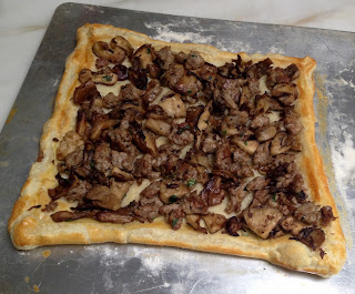 For this recipe, I first removed the sausage from its casing and broke it up as I put it into 12 inch non-stick skillet.  I made the mushroom sauté separately then tossed the sausage and mushrooms together. The puff pastry should be defrosted per the instructions. It usually takes 35 minutes.  If you defrost any longer, it’s hard to manipulate the dough. (I found out the hard way).  The dough has to be pre-cooked or the base will not rise and you’ll have a soggy-bottomed tart.   Then it’s a matter of spreading the mushroom sausage over the partially cooked dough, sending it back into the oven and finally, in the last couple of minutes, spreading the grated cheese over the top of the mixture. Here is the recipe: