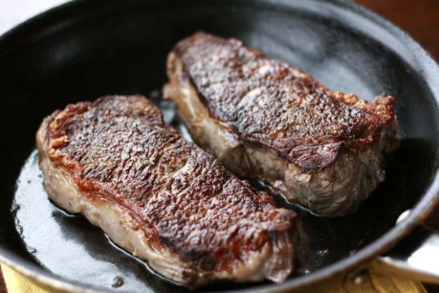 New York Strip Steaks with Tyler Florence’s Mushroom Sauce and Ina Garten’s Cornmeal-Crusted Onion Rings