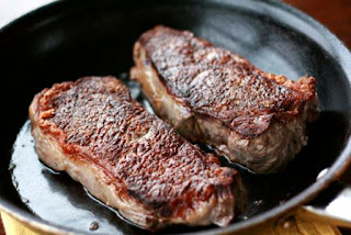 Friday night has been Steak night at our house for a long time. New York Strip is right up there with our favorites.  It’s easy to cook on the stove top and the chewier texture of the steak appeals to the meat-eater extinct.  You can be a purist and simply salt and pepper the steak vigorously, put it into a very hot pan with a tablespoon of peanut oil and one of butter and you’ve got a beautiful steak in about 8 minutes.  But occasionally we like to try it with a sauce to give it another dimension.  This mushroom sauce is both easy and delicious, a take on