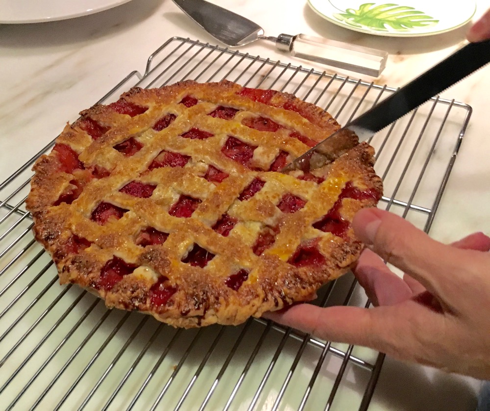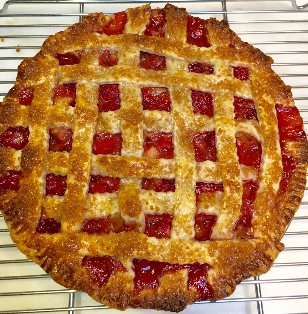 These few past few weeks that’s meant Rhubarb, tart and tangy and grown just over the hill from our house.  And then there are the strawberries from the same farm. Once you have even looked at these two things there is no question that they are not from the supermarket.   And then there’s the taste: Sublime strawberry sweetness and juiciness unlike anything we taste in berries shipped 2500 miles (at least) to get here.  Rhubarb is an even more seasonal treat: it simply isn’t sold except for these few fleeting weeks early in the growing season. Combined, these two fruits were baked into a Demerara sugar encrusted lattice work pie, melding sweet and tart and tangy all together.  The only thing missing was the essential scoop of Vanilla ice cream that seems to exist only to make Strawberry Rhubarb pie irresistible.