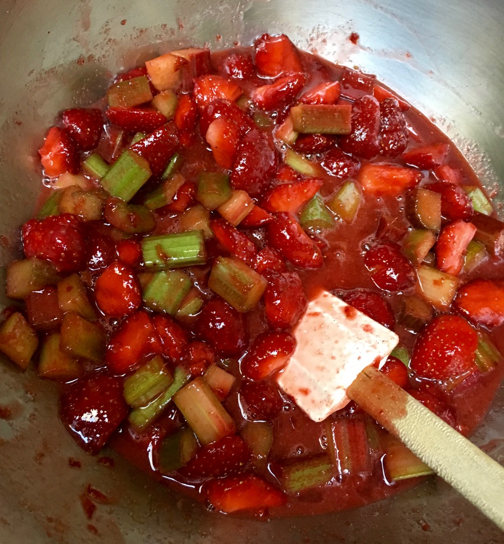 The combination of Rhubarb and Strawberry is so commonplace the one food writer actually published a piece entitled “10 Amazing Rhubarb recipes Without Strawberries!”.  The combination makes so much sense.  The tartness of the Rhubarb combined the sweetness of the strawberry to make a filling that is at turns sweet and tangy.  Andrew worked with a recipe for Rhubarb pie (without the Strawberries)  from “The Four and Twenty Blackbirds Pie Book” (Grand Central Publishing 2013).  Four and Twenty Blackbirds is a bakery in Brooklyn that sells nothing by pies.  It was opened by two sisters from South Dakota, Emily and Melissa Elsen. They hail from a family of pie bakers including their grandmother who baked all the pies for their mother’s locally touted restaurant.  Andrew experimented with today’s recipe to make his own version of Strawberry Rhubarb pie.  The first pie he made was a 50/50 mixture of  strawberries to rhubarb.  This yielded a sweeter pie.  The second pie was 1/3 strawberry to 2/3 rhubarb. It is pretty much a matter of personal taste. While I favored the sweet version, Andrew preferred the tart. You choose.