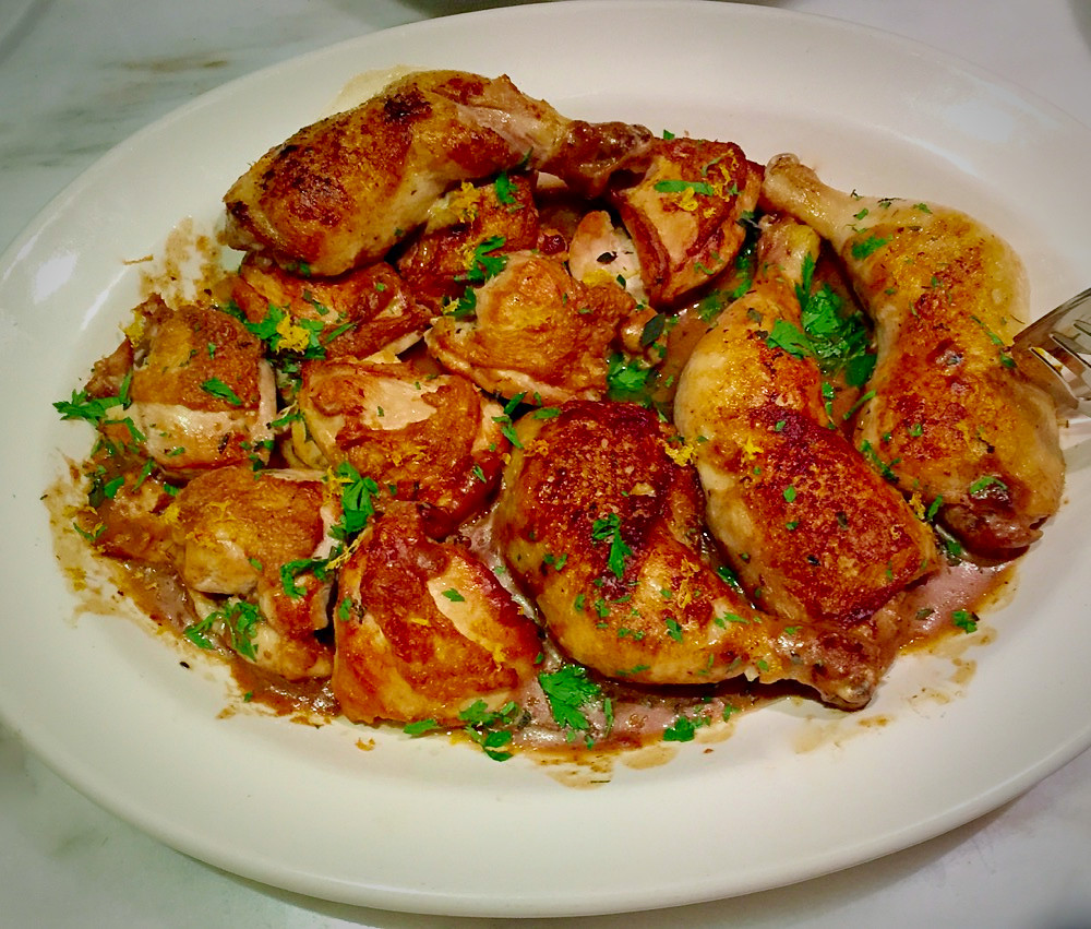 This is because the chickens Rao’s uses are not readily found in supermarkets and because there is no way a home cook can achieve the results Rao’s salamander does. No home broiler is that powerful. And so Cook’s Illustrated, in the person of Annie Petito, set about to create a version that brought this lemon-y, crispy, chicken with its perfect-for-dipping sauce to the home table. As always, Chef Petito did an exhaustive amount of cooking to come anywhere close to Rao’s recipe. In my initial foray into the Cook’s Illustrated version, the results were impressive. Certainly the lemon-y brightness was there. The chicken was infused with lemon flavor while the skin kept its crispness and crunch. But I did have a problem: To me this is dinner-party food and not something I would cook on a weeknight. It requires a little time. So I remade the recipe to break it into manageable blocks of cooking time. All the early prep and partial cooking is done before the guests arrive. The cooking is then halted. Only in the final fifteen minutes before serving does the chicken go back in the oven before briefly resting and being served.
