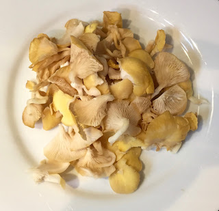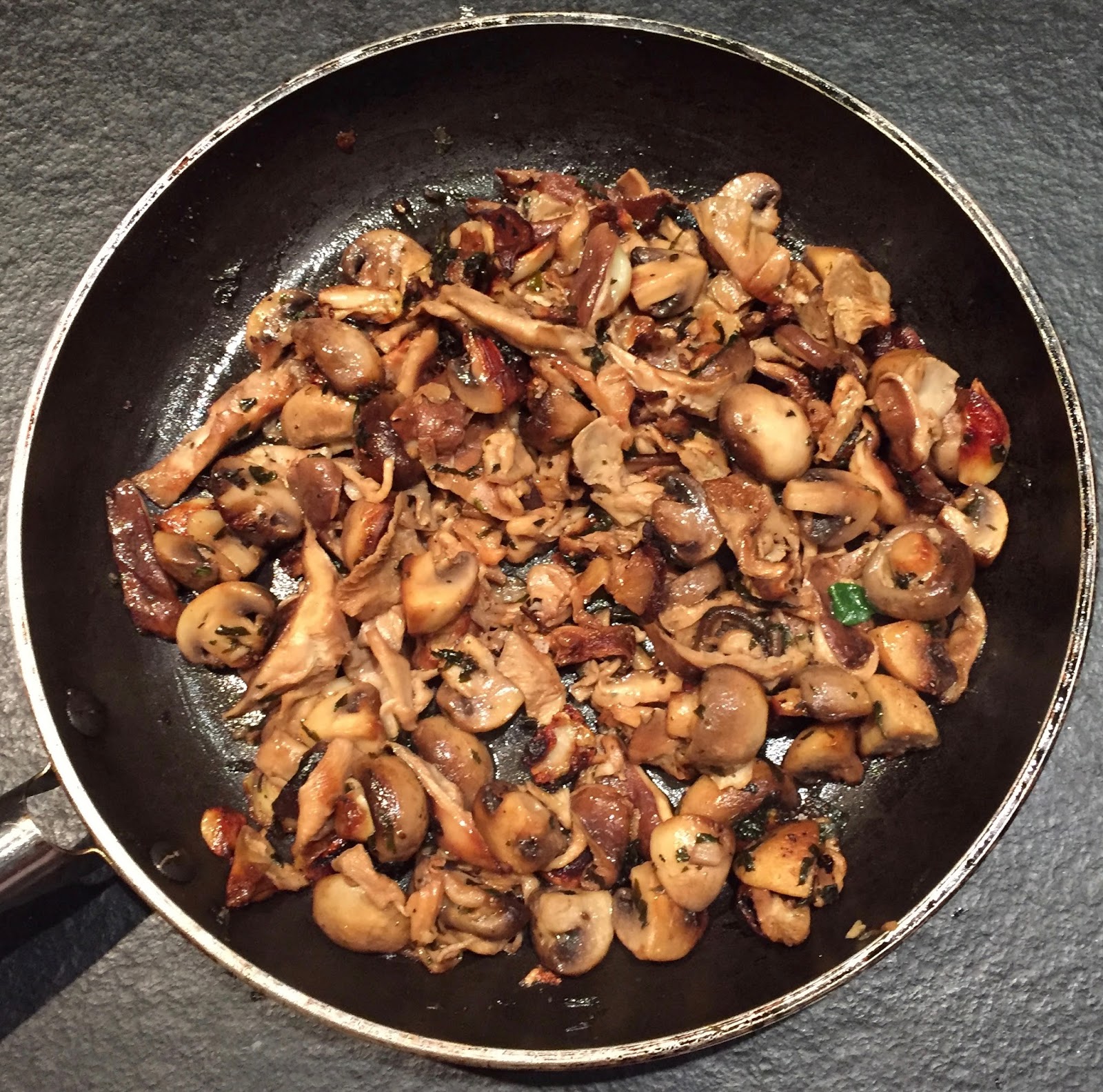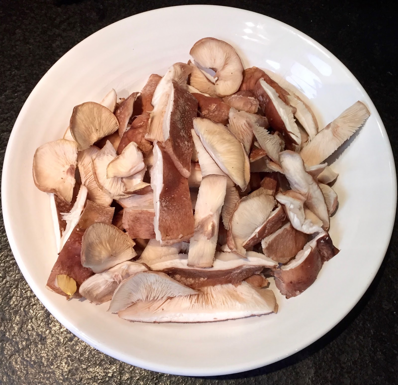 This recipe originally called for five different kinds of mushrooms. But Ottolenghi himself gave full permission to adding or subtracting varieties and experimenting with other mushrooms. I used East End’s Shiitakes and Oysters. I supplemented these with some plain white button mushrooms. The main idea here is to have the quantity needed to do the dish justice and to end up with enough mushrooms to serve the 6 to 8 people the recipe is made for. Ottolenghi’s quantities are in grams but I’ve translated these into ounces for you. You need to have a total of 3 5/8 oz of mushrooms. Be sure to sort through the mushrooms, paring away dirt using a brush to clean them. Do not under any circumstances use water to clean them as they will absorb it and become mushy. Slice or quarter the mushrooms then proceed. Here is the recipe:
