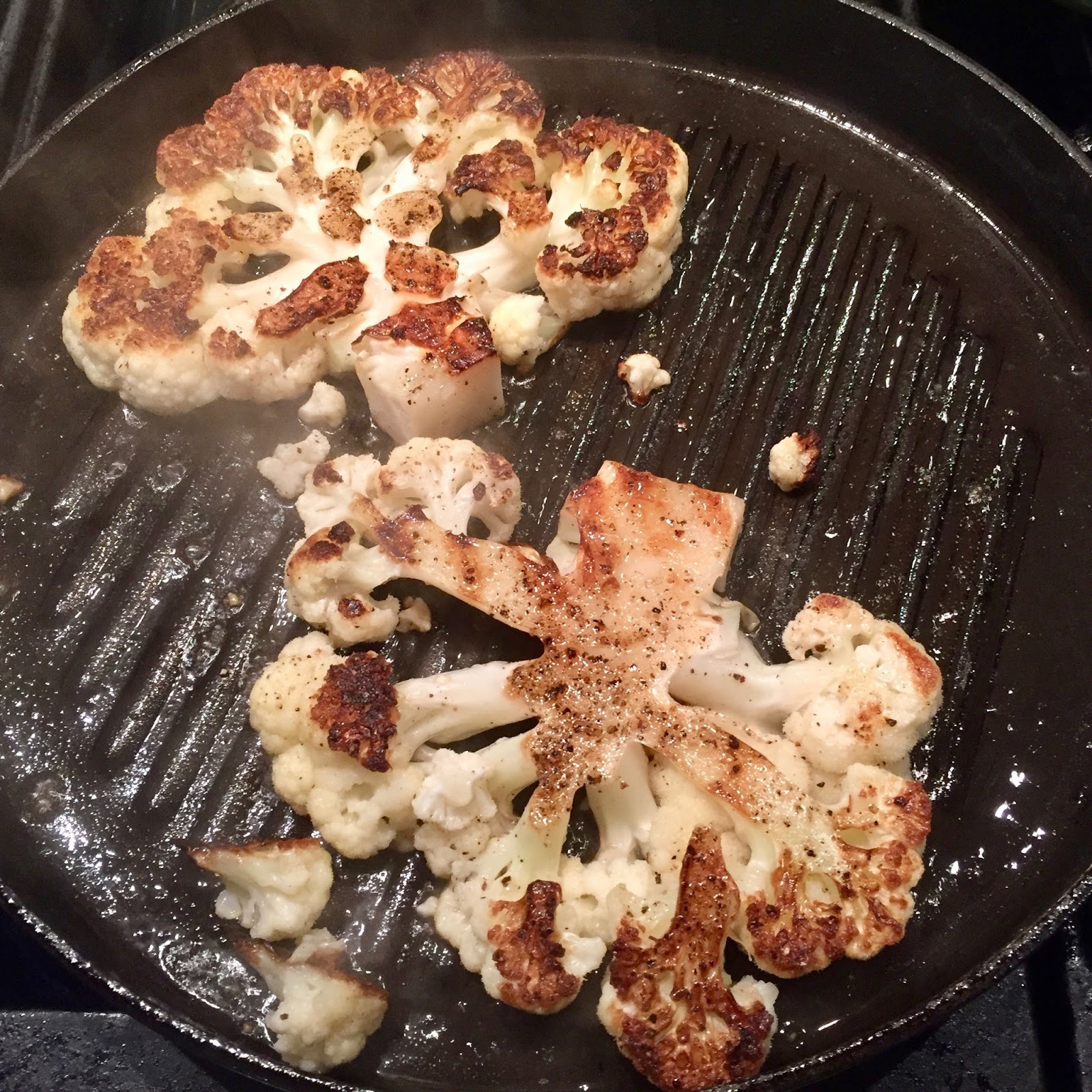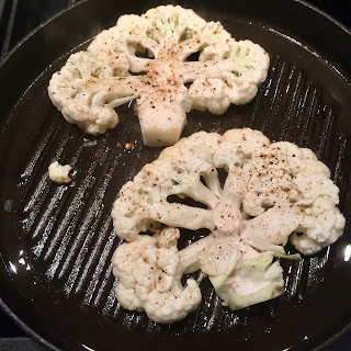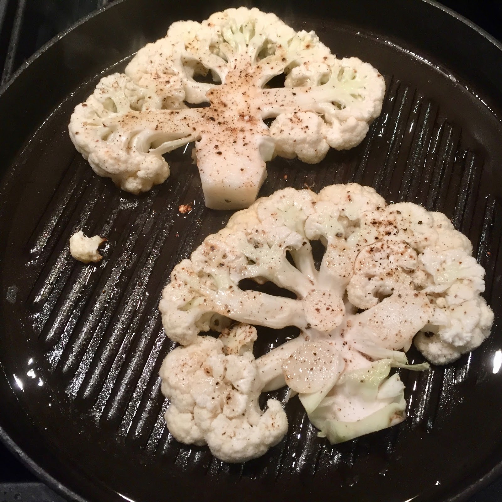 2. Cut the cauliflower from top to bottom into four 1/2-inch-thick steaks. Generously season them with salt and pepper.