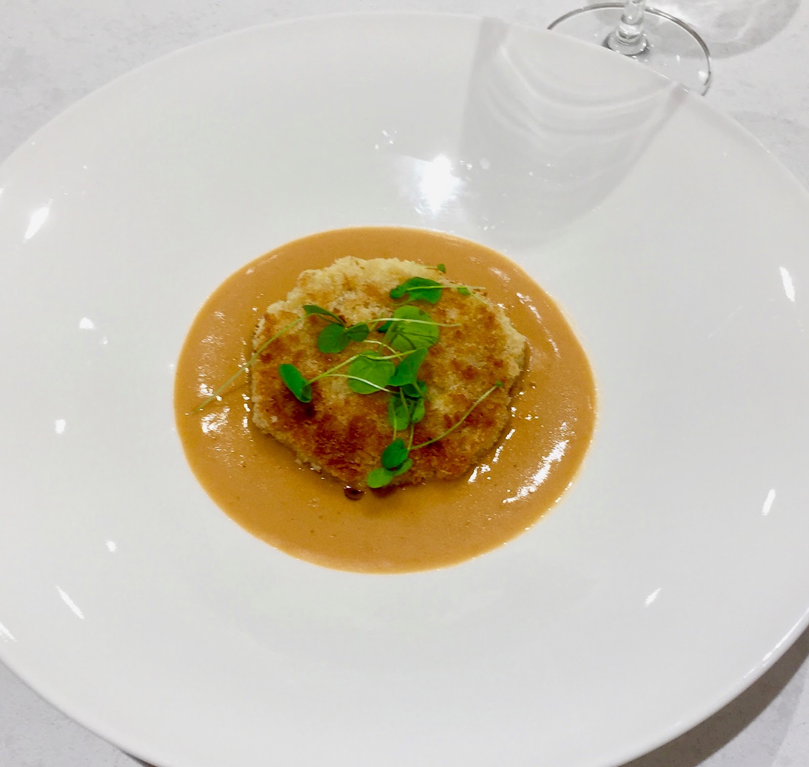 First up was the appetizer, a panko-crusted lobster cake. Golden brown and filled with both lobster and crab meat, the cake sat upon a rich lobster broth garnished with cress. Next up, our main course featured seared mahi mahi, the recipe for which we’ve published here: http://chewingthefat.us.com/2016/11/cuisine-on-worlds-1-cruise-line.html Finally, we came to dessert. Here we created a simply beautiful coconut profiterole dish. Mercifully, the choux pastry used was pre-prepared so it fell on the cooking school class to make the filling, cut the profiteroles in two and pipe in the coconut cream. A lesson in plating followed as we brushed the plate with chocolate sauce, added kiwis, oranges and strawberries, raspberry sauce, and a sprinkle of roasted coconut. At the end of the class, the sommelier appeared with wines to accompany every course and we sat down to lunch with a sense of accomplishment on every plate.