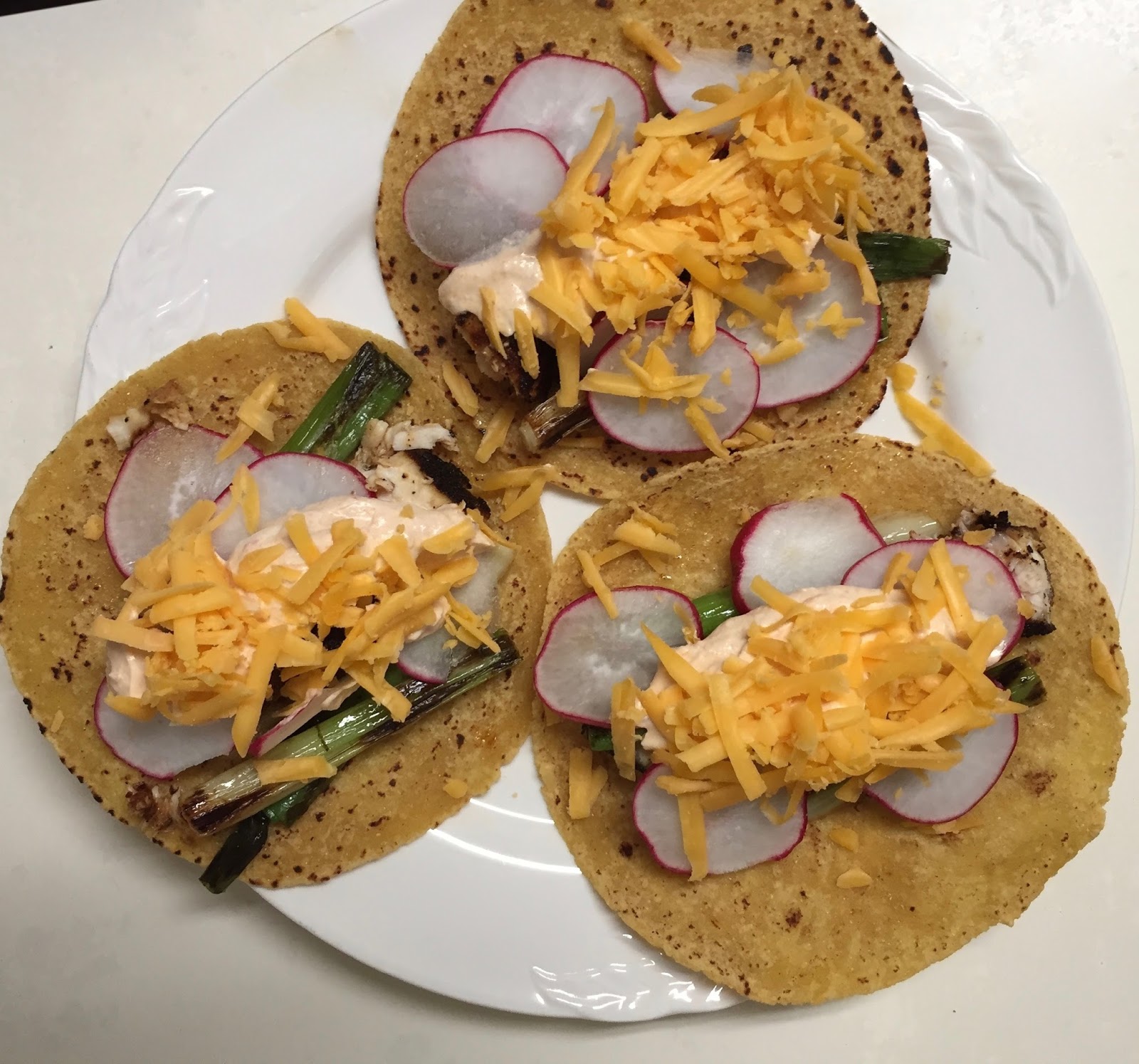 8. Serve the fish with warm tortillas, garnished with the scallions, radishes, cheese and chipotle sour cream, and lime wedges on the side.