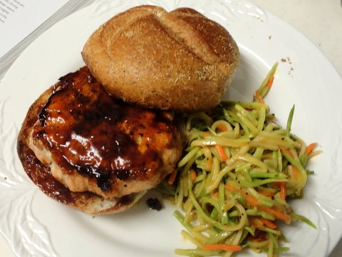 To appreciate this dish, you really should go the whole nine yards. And this is a really simple recipe. It just has a lot of ingredients. And don’t leave off the spicy Asian influenced slaw. The pickled ginger that tops it really sets it apart from ordinary cole slaw. There’s nothing here that you can’t readily find in the Asian aisle in most supermarkets. Hoisin itself is sometimes referred to as the ketchup of Asia. It’s truly ubiquitous. And with the popularity of Sushi at an all time high, pickled ginger isn’t all that hard to find either. Use your food processor to chop the fish. It makes life much simpler. Here’s the recipe: