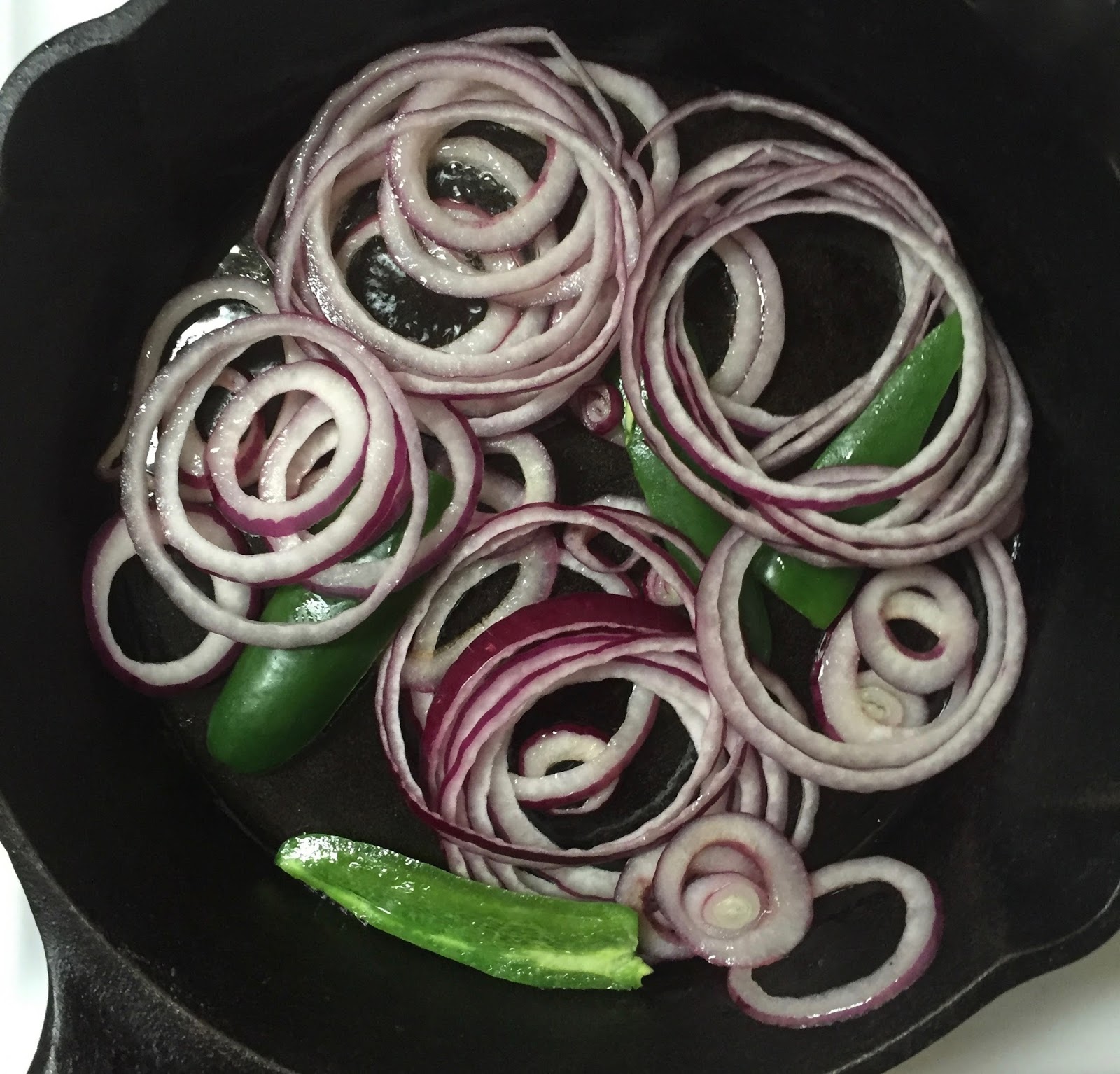 3. Raise the lid of your grill, add the oil to the cooking surface and use a spatula to coat it, then place the onions and jalapeños on the surface, and fry them until lightly browned but still crunchy, approximately 3 to 5 minutes.