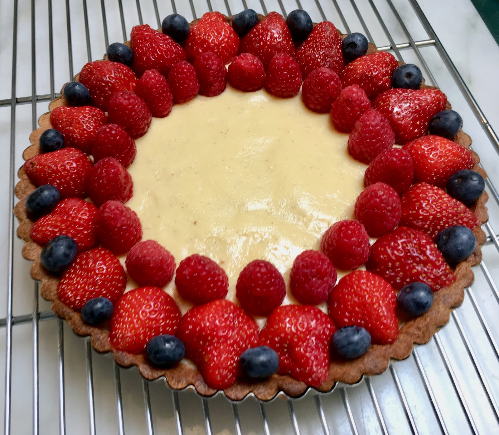 This dessert is a showboat. It looks like it came straight from Paris’ best patisserie. And indeed its inspiration did. It was Dorie Greenspan’s introduction to French pastry, an all-strawberry version and the first pastry she tasted when she first set foot in France. It certainly left some impression because Ms. Greenspan went on to create this recipe herself. The concentric circles of luscious fresh berries conceal the silky pastry cream and the pastry crust itself is beautifully browned. You don’t have to limit yourselves to the three berries Andrew used here. You could make this with a single fruit or more. In Paris, you’ll come across versions where as many as a dozen fruits are cut into pieces and used as toppings. Ms. Greenspan shared this recipe in “Baking Chez Moi” (2014 Houghton Mifflin Harcourt) where she laid down some rules. Follow on and I’ll share them with you.