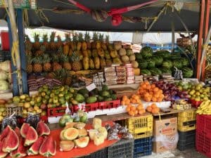 wares from the side of their boats. A little further along the wharf, a second set of Venezuelan boats bring great quantities of fruits and vegetables to the island. Curaçao’s scant rainfall and rocky soil make local cultivation almost impossible. The only reliable fruit on the island is the bitter orange native Laraha, the Golden Orange of Curaçao, from which Curaçao, the liqueur is made which, after a walk through the local market, was where we headed next.