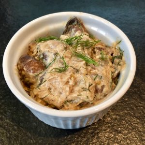 In the realm of side dishes, this one adds a completely new dimension to one of my favorites: Mushrooms. First, the leeks provide a sweet counterpoint to the earthy flavor of the Creminis I used. And the addition of yogurt gives the dish a smooth tang and the dill just the right note that is both unexpected and delicious. And if you’ve ever used