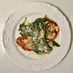 Today’s recipe starts with quickly sautéing baby spinach with a little oil and salt. Then two chicken breasts, which have been pounded to a half inch thickness are cooked in the same skillet as the spinach until they achieve a golden-brown color. They are set aside while a simple sauce of chicken stock and heavy cream is added to quickly cooked shallots and garlic. The sauce is reduced by half, two tablespoons of parmesan cheese are added and then, for a bright note both lemon zest and lemon juice finish the sauce. The spinach is stirred into the sauce, and the chicken is then topped with it and another couple of tablespoons for parmesan. Here is the recipe.