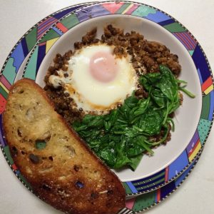 This dish starts with a soffritto of onion, carrots, fennel bulb and garlic. “What’s a soffritto?”, Andrew asked. “It’s another Italian word for a battuto.” I answered, not to Andrew’s satisfaction. A soffritto, (I had to look it up) means “lightly fried” which is what you do to this combination of vegetables. There’s quite a bit of stove time in this recipe. It takes a good hour and twenty minutes to come together. But the flavors of the lentils and vegetables make it all worthwhile. Then there’s the genius of poaching the egg right in the stew. The time given for that is 8 to 10 minutes. I think that’s on the far side, especially if you prefer a runny yolk. And finally, the recipe calls for the spinach to be microwaved and draped on top of the beans along with the eggs. I stopped at the microwave and laid the spinach atop the lentils to keep it green and luscious looking. Finally, there’s a wonderful piece of fried bread…gently salted and rubbed with garlic. Just enough evil to make this dinner a winner. By the way, I halved the recipe which is for four. And I had plenty of lentil stew left over. Here is the recipe: