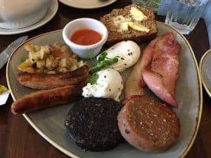 This meal was traditionally made to fill the bellies of those with a full day of heavy duty work ahead of them. Now it is typically enjoyed on a sleepy Sunday morning. The full spread consists of bacon, black and white puddings, sausages, eggs, vegetables — typically tomatoes and mushrooms — and potatoes or potato bread all fried up in creamery butter.