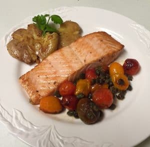 A wonderful way to pair the rich sweetness of salmon with a tomato caper accompaniment that is its perfect accompaniment