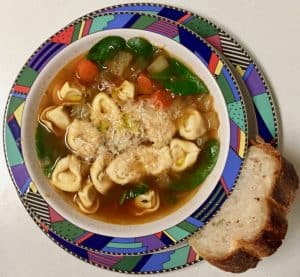 A warming bowl of flavorful broth, chunky vegetables and pillows of cheese-filled Tortellini.