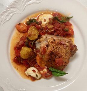 It starts with the pancetta which is sautéed until crispy and brown. The chicken is cooked directly in the pancetta fat adding a porky goodness. Once beautifully browned the chicken leaves the skillet to be replaced by garlic, anchovies, capes, chile flakes and finally ripe cherry tomatoes, reliably flavorful no matter the season. Don’t leave out the anchovies. These melt down and have absolutely nothing to do with your memory of the last bad Caesar Salad you were served. They’re just another layer of flavor here. Back in goes the chicken and the skillet goes into the oven baking the flavor into it. Finally, fresh mozzarella in the form of boccacini gives you that ultimate pizza topping. Garnished with basil, the dish should be enjoyed with crusty bread to sop up every drop of deliciousness. Melissa used a cut up three-and a half pound chicken. I went with four thighs which cut the recipe down to size for two. I kept all the other ingredients exactly as Melissa wrote it. Here is the original recipe.