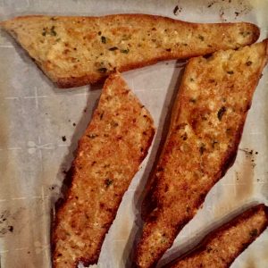 Going through some files as I settle in to our new apartment, I came across a picture that stopped me in my tracks. It’s the main illustration for this page courtesy of Epicurious. Here were these crispy halves of great French bread topped with a coating of cheese and herbs I could almost taste. I knew at once that this was something I was going to make first chance I got. The recipe was part of Bon Appetit’s ‘fast, easy, fresh’ series that even spawned its own cookbook “Bon Appetit Fast Easy Fresh” (John Wiley and Sons 2008). The book had over 1100 recipes but Garlic Confit Toast didn’t make it. It was published in 2015. It was the work of Claire Saffitz which gave the recipe instant credibility as she has two of the most requested recipes on Chewing The Fat. (See link below the recipe to see what they are.) Now ‘fast, easy, fresh’ seems to have gone the way of BA’s former Editor, Barbara Fairchild. Famously, Ms. Fairchild refused to move to New York when the magazine did. Her replacement, Adam Rapaport has offered up “Basically” and “Healthy-ish” and ‘fast, easy, fresh’ is no more. It will live on in memory and in real life because Garlic Confit Toast will be on our menu much more than just once.
