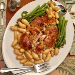 Olney also taught cooking classes and the recipe for Zucchini-and-Herb Stuffed Roast Chicken was a particular favorite. It then ended up in “Simple French Food”. Its name neglects several key ingredients that go into its stuffing. Ricotta and parmesan cheeses give it enormous flavor and creaminess to say nothing of keeping the bird beautifully moist. The stuffing rests under wonderfully crisp skin. It relies on spathcocking the bird—that is the process of removing the backbone and flattening the chicken. This makes the chicken cook more evenly and cuts down the cooking time too. I decided to follow a bit of recipe advice which was to prep the dish the day before I was going to serve it. It sat in the fridge overnight absorbing the flavors of the stuffing. The prep the day before makes this a really great dinner party dish as all you have to do is pop it in the oven for about 50 minutes, then let it rest, then carve and serve. You will note that the recipe makes no mention of the overnight technique because it is entirely possible to do this all the same day you will serve it.