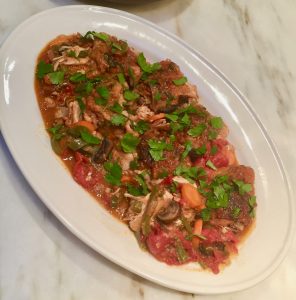 In looking through the catalog of recipes for the dish, I gravitated to this one precisely because it was loaded with vegetables and bright, fresh flavors. Almost all recipes call for a 3 to 4 lb. chicken cut into 6 to 8 pieces. I made it with 12 skin-on thighs so it was full of chicken flavor. It’s a dish that takes its time, especially since I wanted to reduce the sauce quite dramatically at the end. But it’s one of those dishes that’s worth every minute you put into it. Here is the recipe.