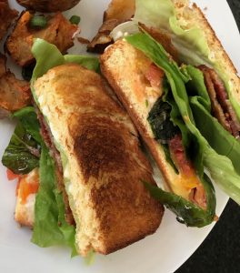 30 minutes. Thick cut is pretty well essential to the sandwich and I made sure each sandwich had plenty of it—two big strips of it. I love Butter lettuce above all others and I am particularly fond of the hydroponically grown lettuces found at Costco (and elsewhere). They seem to keep forever—at least a couple of weeks—and can be easily pulled apart to into individual leaves. For mayonnaise, I do use Hellman’s although I switched over to their Olive Oil based mayo imagining it to be healthier. It is actually lower in calories and fat but I likely more than make up for the difference by slathering it over the toast.