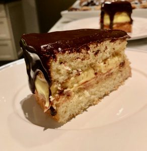 While custard cakes were nothing new, what was new here was using baking chocolate as a coating. Chocolate had been made in neighboring Dorchester MA since 1806. Strangely and for no reason I can uncover, chocolate was eaten at home and not in restaurants. Chef Anezin created quite a stir by using it at the Parker House. It became an enormously popular menu item first called ‘Parker House Chocolate Cream Pie’ and finally ‘Boston Cream Pie’. But despite its popularity, it was not until December 12, 1996 that it was named the official dessert of the state of Massachusetts.