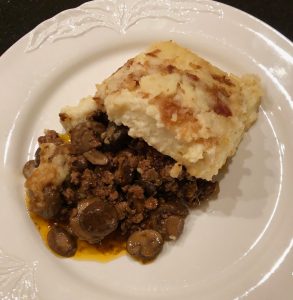 When I was growing up, this dish passed for Shepherd’s pie at our house.  It usually involved the leftover Sunday Roast and any mashed potatoes that managed to survive our wonderful Sunday family dinners. But if you want to create a controversy, using beef in Shepherd’s Pie really sets people off.  Shepherd’s Pie is a traditional British dish made with minced lamb.  But when the dish crossed the Atlantic where lamb was expensive and beef was not, most recipes give you the option of using one or the other. The bones of this recipe came from one Martha Stewart published calling it “Cottage Pie” so that’s what it’s called here.