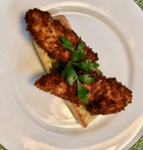 The great thing here is that you can do all the necessary frying of the chicken well in advance of dinner. Put all the finished golden-crusted chicken onto a rack over a sheet pan and keep them warm in a 200-degree oven or in your warming drawer. Minutes before you want to serve then, halve the baguettes lengthwise, slather them with pesto and run them under the broiler until the edges brown and the pesto bubbles. Set everything up and let your guests ladle the Caponata over one crispy baguette and top the second one with the Parmesan-crusted Chicken. Here are all the recipes: