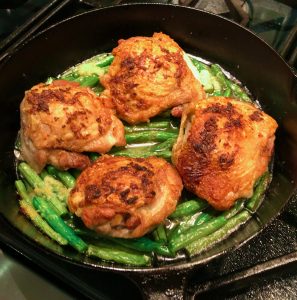 Andrew’s sister Lauren and I have a great time finding comments on recipes that are off the wall. These are from people who cooked an entirely different dish. They substitute so many ingredients that their dish could not possibly resemble the recipe they are angrily commenting on. We found Meghan Splawn’s great recipe on thekitchn.com. This garlicky, ultra-crispy Chicken Thighs on a bed of Green Beans uses just 5 ingredients. So substitutions weren’t the commenters problem here. Their complaints were about the admittedly daunting word “Life-Changing”. “Since I don’t like the dark meat of chicken, I sincerely doubt that this recipe will change my life,” wrote Soulee 10. JCFricke at least made the recipe. But he or she followed the familiar pattern of overruling the technique for creating the sublimely juicy interior and then moaned about how the recipe was “not Life-Changing for me”. I am happy to tell you it really was “Life-Changing” at our house: Andrew, a white meat/breast fancier, owed as how the thighs were now his favorite part of the Chicken. Bravo!