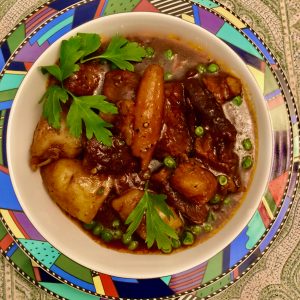 Sauté. This replaces the often-used technique of tossing the meat in flour before it is seared. And that’s great news if you want to keep this recipe Gluten-Free. To finish off the dish, swirl in your favorite frozen peas for a pop of color and a note of sweetness. Garnish with parsley and serve the stew over buttered egg noodles or have some crusty country bread on hand to soak up the gravy. Here is the recipe and after if, some other Instant Pot recipes to enjoy.