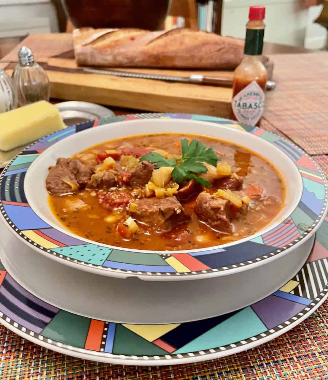 STEW WEATHER HAS LASTED LONG ENOUGH. BUT WE’D MAKE THIS PORK AND WHITE BEAN STEW IN A HEATWAVE.