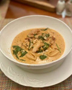 Italian-inspired, Marry Me Chicken is a one-skillet dinner cooked entirely on the stovetop. The light, creamy sauce features bright tomato flavor from sundried tomatoes and paste. Add onion, garlic, chicken, cheese, pasta, and for color, a handful of baby spinach,  Then serve it with rice, potatoes or just a great loaf of bread. The sauce just begs to be eaten down to the last drop.  That sauce is so good, what if Marry Me Chicken was turned into soup?  And what if you cheated by using leftover chicken—rotisserie or otherwise?  That’s exactly what this recipe does: By adding Chicken Stock, Heavy Cream, and Sundried Pesto Sauce, you can create this one pot soup in about an hour…most of which is completely hands-off.