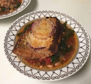 Ribollita is a cousin of Minestrone (well represented on Chewing The Fat: Go to https://chewingthefat.us.com/?s=Minestrone) and shares DNA with other Tuscan comfort foods. Its essentials—cannellini beans, tomatoes, carrots, celery, onions, kale, and stale bread—deliver the kind of honest flavor that lingers in memory.