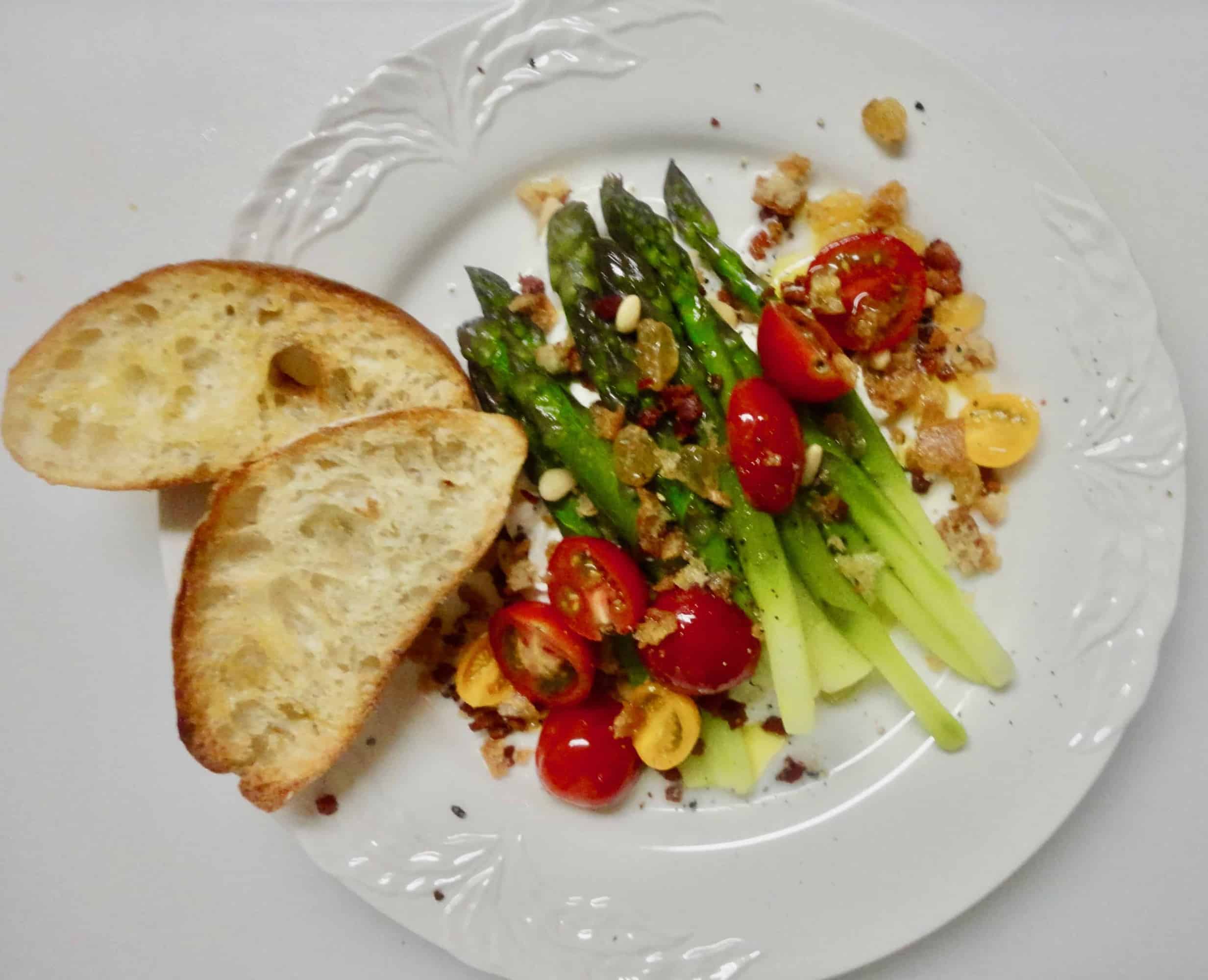 Fresh Asparagus Salad with Buratta, Pancetta, Pine Nuts, Raisins and Bread Crumbs and Tiny Tomatoes