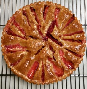 For this tart, Andrew chose both plumcots and pluots. The recipe came from John Barricelli’s “The SoNo Baking Company Cookbook” (Clarkson-Potter 2010). Barricelli worked with Martha Stewart. One of his tasks was to plan Martha’s weekend entertaining. One summer she asked him to make a plum tart for a dinner party. This was the one he made. Barricelli used 8 different plums and their hybrids for the tart for a rainbow of color. Andrew’s tart was every bit as beautiful and lush. The Almond cream was a perfect foil for the juicy plums and the pastry added another layer of sweetness. Here is the recipe.