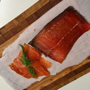 Now to a New Yorker, Cured Salmon is practically an indigenous food. This is especially true of “Lox” which derived its name from the Yiddish word for salmon: laks. It is sometimes called “Nova”, a tribute to Nova Scotia where it was caught. And of course, there’s also Smoked Salmon. They’re quite different. Lox is never cooked and it is only made from the salmon’s belly which is then cured in a salty brine. Smoked Salmon, while similarly salt-cured, can come from any part of the fish and not just the belly. It’s either cold-smoked, which makes its texture similar to lox and gravlax, or hot-smoked which gives it a firm, flakiness and smoky flavor.
