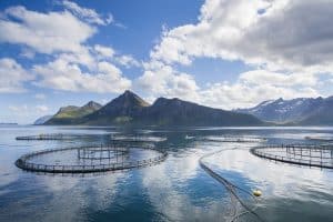 Norwegian farmed salmon are not crowded into pens. Not at all. Instead Norwegian law forbids salmon making up more than 2.5 {7764cd352edcf19b608e75b52a560f8f0623df8defec59f0ed185161f2ba1413} of spacious protected ocean pens. Put another way, 97.5 percent of the volume in the salmon growing pens is made up of water. These round net enclosures are up to 650 feet in circumference and they’re up to 150 feet deep. The fish are fed a diet of both raw vegetable and raw marine materials, all-natural of course, and completely free of antibiotics. Their diet is astonishingly efficient—especially compared to other proteins: Salmon consumes a little over a third of the volume of food needed to raise pigs and less than one sixth the amount of feed necessary to produce the same amount of beef.