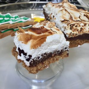 Cheryl and Griffin’s version consists or a salty, crunchy graham cracker crust topped with a rich chocolate ‘brownie’ filling and a fluffy, light, meringue that imitates the traditional marshmallow. It helps to have a blowtorch to get the required brown crust although you can achieve the same result with a very carefully engineered and timed run under the broiler per the recipe. You end up with a beautiful ‘cake’ which you cut into bars and serve. Here is the recipe: