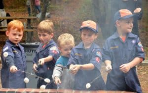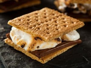 A marshmallow, usually on a metal or wooden skewer is heated over the fire until it is golden brown. The marshmallow should be gooey but not burnt. However lots of S’more fans like theirs anywhere from barely warm to charred completely. The marshmallow then tops half a graham cracker and a piece of chocolate. Finally the other half of the graham cracker tops the whole S’more.