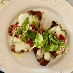 Coming across this recipe was like running into an old friend.  It’s from “Bobby at Home: Fearless Flavors from My Kitchen” (Clarkson Potter 2019), Bobby Flay’s latest cookbook. In it he says, “I challenge you to find someone out there who won’t succumb to a plate of Chicken Parmesan.”  Since I basically went straight from the book to the Supermarket, I’d would be one of those who succumbed.  This is such a great dish. Let’s face it, it’s basically fried chicken topped a rich Marinara sauce and a lot more fresh mozzarella than Parmesan. And in this iteration, with its arugula topping, it’s a one-dish wonder. As to ease, it also permits the use of store-bought Marinara Sauce.  And I discovered that using the split chicken breasts, that have been cut into two cutlets, didn’t even need the prescribed meat pounder.  I had this lovely dish on the table in all of 30 minutes.