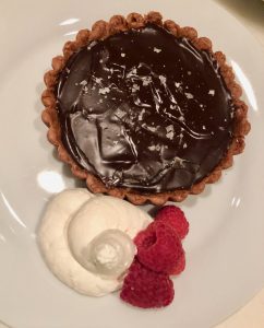 The publicity for the re-issue of the book led to the re-publication of one of her most famous recipes. The one we share with you today. It was one of her signature recipes at Gramercy Tavern. It is both sweet and salty. And it is simple. Just three elements make up this incredibly elegant dish. A chocolate pie crust filled with luscious soft caramel and then glazed with the shiniest of chocolate ganaches. The real showstopper here is the salt. Ms. Fleming explains: Sprinkling fleur de sel on chocolate intensifies the flavor of the chocolate without making it taste salty. The recipe initially was for a 10-inch tart. Andrew made these into individual 3 ¾ inch tarts. The size does nothing to the flavor of course. The chocolate pastry, the meltingly creamy caramel, and the chocolate ganache are all there topped with a sprinkle of the essential Fleur de Sel. Here is the recipe, and after it some other tarts you might like.