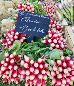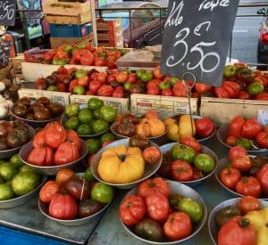 Paul Bocuse lived to be 91 years of age and died in 2018. So beloved in his native city, an enormous portrait of him has been painted directly across from the astonishing Food Hall named for him. Les Halles de Lyon Paul Bocuse is worth exploring. It’s filled with great things to eat on the spot –from fresh oysters to some of the most intriguing pastries on earth. And you can eat your heart out Monday through Saturday from 7 am until 10:30 pm, Sundays until 4:30. Since Chef Bocuse’s mission was to lighten French cooking, he was likely drawn to the extraordinary quality of produce in Lyon. Across the Rhone River to the Soane River from Les Halles is another phenomenal “marché”. The tomatoes for today’s recipe could well have come from there.