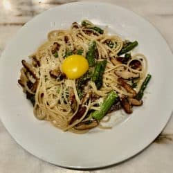 The first asparagus of the season is something we can’t wait for. Asparagus has become a virtually year-round staple, imported off-season from South America. But nothing compares to the home-grown variety. We love asparagus so much that it appears in no less than 30 recipes on Chewing The Fat. (I’ll post a compendium of them just before today’s recipe.) The first thing I decided to cook this asparagus season was a great twist on Carbonara. The Roman pasta dish is made with egg, hard cheese, cured pork, and black pepper. There’s no pork in this version. It’s pure vegetarian. Shiitake mushrooms, asparagus, and Reggiano Parmigiano makes the sauce. For the Carbonara portion, egg yolk is stirred into each portion steaming hot serving of pasta. The egg makes the dish, an unctuous sauce that coats the vegetables, cheese and pasta. I switched to Jumbo Eggs to get as much yolk into the dish as possible. And it really paid off.