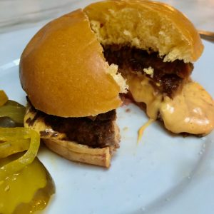 This burger seals the cheese in the middle of two thin burger patties. We love cheeseburgers so we upped our cheese to two slices of American Cheese. We divided our 6-ounce patty into two balls and squished the balls down with our hands. The trick here is to make sure you’ve sealed the cheese in properly because you don’t want it to gush out in the cooking process. It’s traditionally served with grilled onions and Bread and Butter pickles on the side.