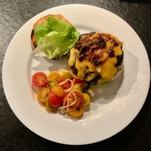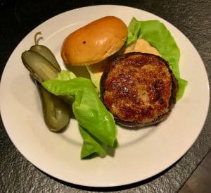 Need I tell you, they are also perfect for a crowd. There are seemingly endless variations. I avidly collect Burger recipes. I am intrigued by regional burgers like today’s Juicy Lucy, a staple of Minneapolis MN. I have a passion for the crispy exterior of the ultra-thin Smashburger whose weight justifies its two patties and double cheese and just about anything else you can put on a burger. Then there’s the Portobello Mushroom burger but before you think it vegetarian, mine’s not. It stuffed with Sweet Italian sausage. And what about that leftover Portobello from the two-pack they come in? Behold the Mushroom Burger in which you Cuisinart the Portobello cap, add it to ground beef and voilà.